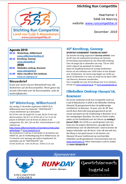 De Run competitie is een wedstrijd over diverse lopen in het Land van Cuijk & Maasduinen. Een seizoen loopt over 2 kalenderjaren van 1 augustus tot 30 juli. Deelnemers aan de afzonderlijke lopen worden opgenomen in de stand en als je het minimaal vastgestelde  evenementen uit loopt doe je mee voor het eind klassement.